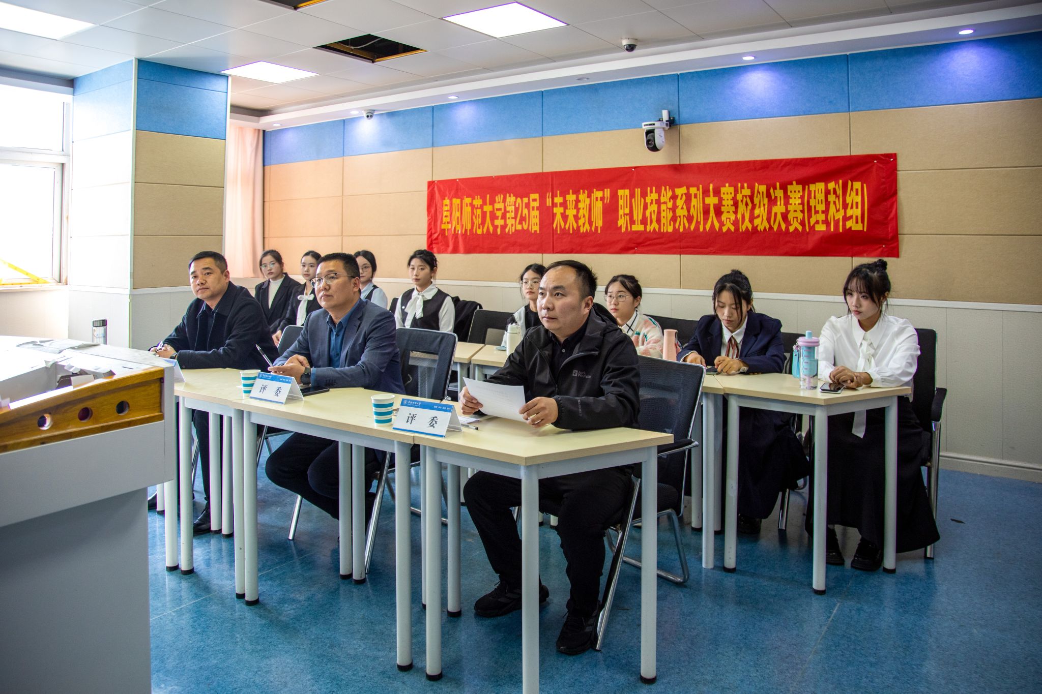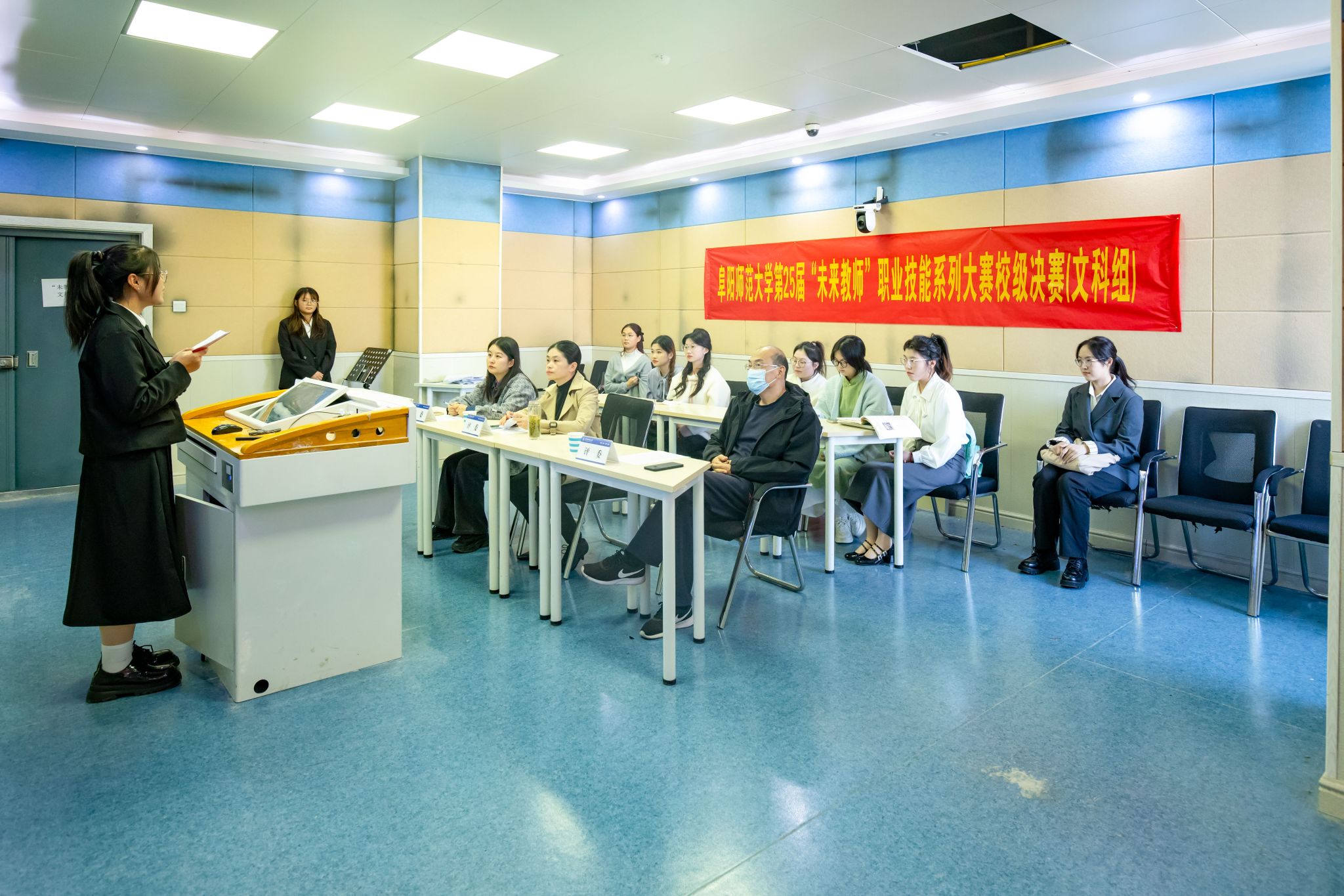 为深入学习贯彻党的二十届三中全会精神,贯彻落实习近平总书记“四有”好老师重要讲话精神,为学子提供锻炼自我、提升能力的舞台,助力学生在实践中增长传道授业解惑能力,11月6日,我校在西湖校区正行楼5楼教师教育综合技能训练中心举办第25届“未来教师”职业技能大赛。阜阳市颍州区政协副主席王海静、阜阳市教育局教科所所长吴奇、共青团颍州区委书记朱囡囡担任文科组评委;阜阳市颍东区科学技术协会副主席张文武、阜阳市第十一中学教育集团副校长宫朋飞、阜阳市城郊中学办公室主任王俊担任理科组评委;阜阳幼儿师范高等专科学校美术教研室主任俞超群、体育教育教研室主任李静、中国少数民族声乐学会常务理事金瑞峰担任艺体组评委。来自全校各学院的17名文科组选手、21名理科组选手以及6名艺体组选手参加比赛。
