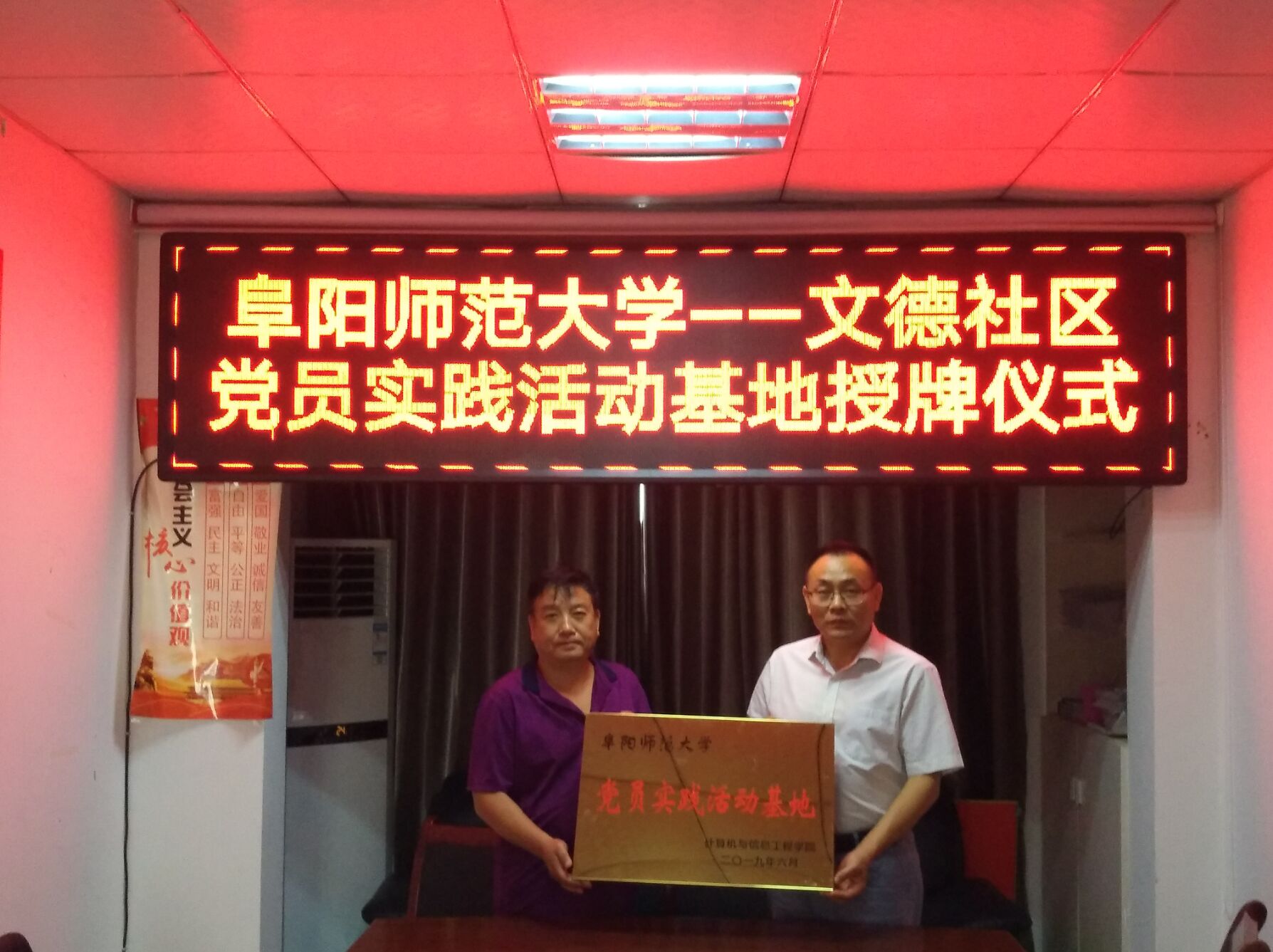 6月27日上午9:00,计算机与信息工程学院 “党员实践活动基地”授牌仪式在阜阳市颍州区鼓楼街道文德社区党总支会议室举行。文德社区党总支书记岳君,副书记刘海华,计算机与信息工程学院党委书记朱明山,物联网与信管教研室党支部书记韩波,党委秘书、计科专业学生第一党支部书记岳申一同出席授牌仪式。