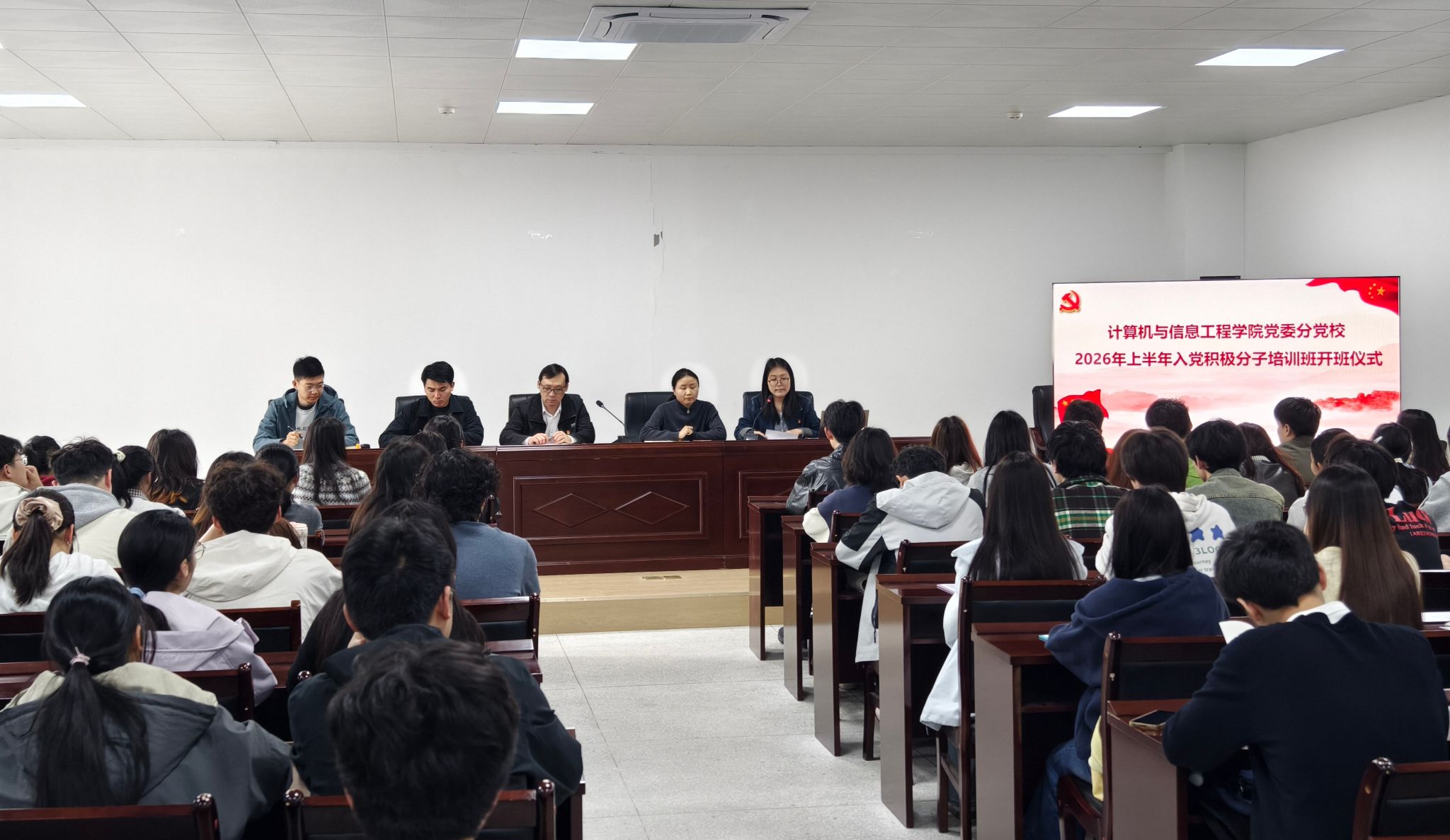 4月15日下午,计算机与信息工程学院在新工科楼A500举行2026年上半年入党积极分子和党员发展对象培训班开班仪式。学院党委书记韩天鹏、各支部书记、党委秘书、党委组织员及全体参训学员出席仪式,开班式由组织员赵维维主持。