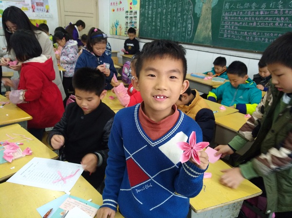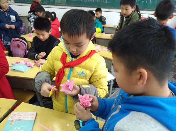 手工课开始了,岳申带领同学们用粉色纸张折叠五瓣樱花的花瓣,然后用双面胶带进行黏贴,完成伞状花序的樱花花朵。在制作现场,同学们都能全身心的投入到手工制作中,相互交流制作方法,互相学习。当同学们顺利完成自己的作品时,脸上露出了微笑,同学们彼此分享着自己的劳动成果,快乐与幸福溢满了同学们的心田。