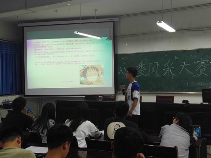 比赛开始由主持人介绍本次比赛参赛规则。接下来每位参赛心理委员先是根据PPT讲述自己身为心委的日常工作和心得,在演讲完毕后回答了评委们的提问;有些选手还为本次大赛准备了才艺展示,大赛取得圆满的成功。