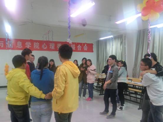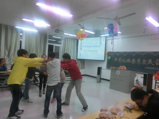 活动在主持人美妙的声音中拉开帷幕,首先,在一个相对开放和自由的环境中,新老心理委员开始相互交流,由13届心理委员向11、12届优秀心理委员提出问题,在学长、学姐们的解答下,让13级心理委员更加了解了他们的职责,更加提高了对心理健康的重视;接下来,新老心理委员之间玩了一些小游戏,增进了新老心理委员之间的感情,大家玩的都很开心,现场气氛达到了活动的高潮;最后,新老心理委员共同观看了《老友记》这段视频,然后每个人都对朋友这个词发表了自己的看法,现场气氛十分温馨,让人感动不已。最后,在一段安静美妙的音乐中,这次活动圆满地结束了。