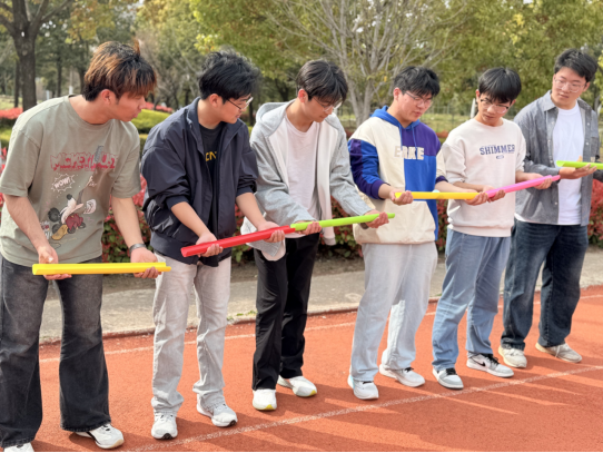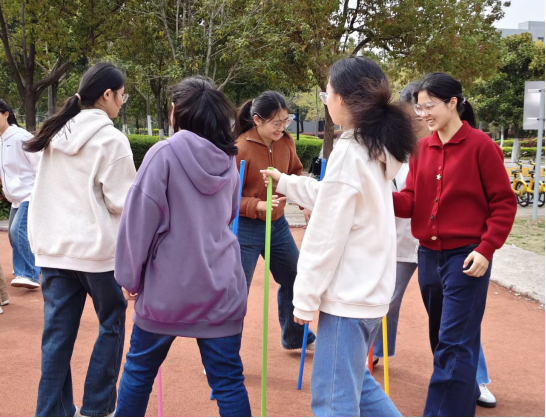 本次活动设置了“不倒森林”“两人三足”“珠行万里”“筷子夹球”等趣味团体项目。在“不倒森林”项目中,同学们手持长杆围成圆圈,在杆与杆的交接与扶持间,锻炼了专注力与责任意识;“两人三足”赛道上,大家绑腿同行、接力竞速,在步伐磨合中感受到宿舍同伴携手前行的温暖力量;“珠行万里”环节里,成员们用PVC管接力传递小球,在管道的衔接配合中建立起团队信任与预判能力;“筷子夹球”挑战中,大家依次传递小球,在稳控节奏的过程中学会了包容与鼓励。整场活动中,同学们在欢声笑语中卸下学业压力、敞开心扉,在分工协作中拉近了距离、增进了理解。