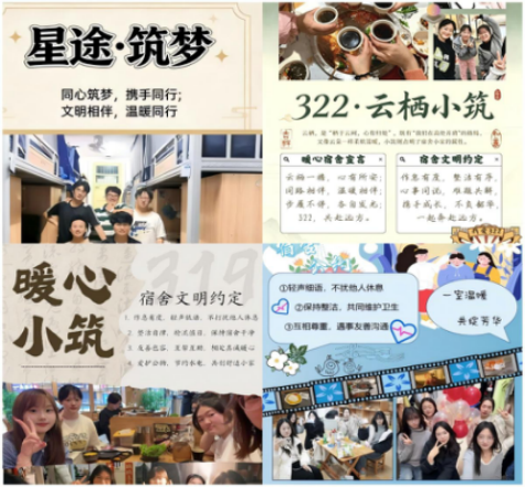 在宿舍文化海报设计比赛中,同学们以宿舍为单位,将学科特色与宿舍文化有机融合,创作出一幅幅富有创意与温情的作品。海报不仅展现了各宿舍独特的集体风貌与凝聚力,也传递了文明同住、温暖相伴的理念,充分激发了学生的创作热情与集体荣誉感。