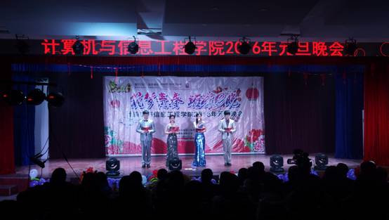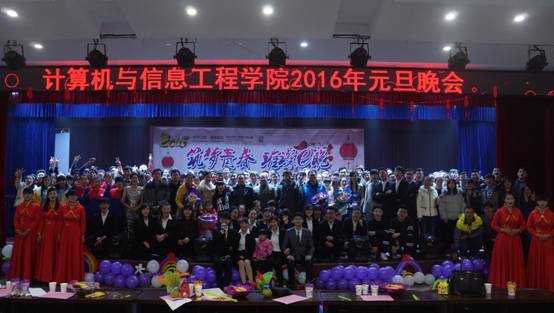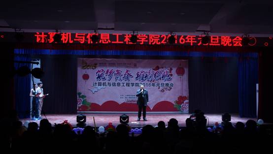 为了丰富我院学生的大学生活,激发同学们对大学生活的激情,培养同学们的文艺素养,同时也为了迎接即将到来的元旦佳节,12月24日晚,计算机与信息工程学院2016年“筑梦青春,璀璨e晚”主题元旦晚会在西区小礼堂隆重举行。校学生处处长檀竹茂、校团委书记张建、校学生处副处长宋东锋、校大学生创业服务指导中心主任徐朝东、我院党总支书记朱明山、院长王戴木、副院长王峰以及各位老师和学生近500人观看了此次晚会。部分兄弟学院学生会主席也应邀参加。