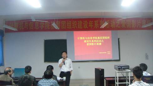 为贯彻落实十七届六中全会精神,推进高校社会主义核心价值体系建设。近日,计算机与信息学院开展爱国主义系列影片展播活动。全体教师和各班级主要学生干部参加了启动仪式并一同观看了电影《钱学森》、《仰望星空》。启动仪式结束后,各个班级、团支部纷纷响应号召,组织开展了以学习钱学森为内容的主题团日活动。活动中,同学们积极参与,纷纷表达了对钱学森崇高的共产主义理想和爱国主义情怀的敬佩之情,激发了广大同学的爱国之情与报国之志,增强了自觉弘扬和践行社会主义核心价值体系的意识。(徐悦 供稿)