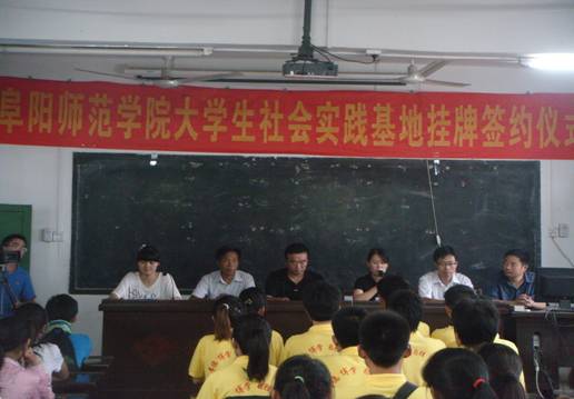 启动仪式于下午五点正式开始。来自舒庄中心学校和阜阳师范学院计算机与信息学院的领导、老师、在校中小学生以及大学生志愿者参加了此次活动。首先,舒庄中心学校张校长对15名志愿者的到来表示了热烈的欢迎,同时高度评价了志愿者的实践活动,并对学校积极引导学生走入社会参加实践活动的做法表示高度的赞扬。接着,我院党总支副书记于少华老师发表了重要讲话,叮嘱同学们要注意安全,努力锻炼自己,增强个人能力,希望同学们以建团90周年为契机,积极担当社会责任,为日后建设社会主义和谐社会贡献自己的一份力量。最后,我院党总支副书记于少华老师与舒庄中心学校王校长共同为计算机与信息学院暑期“三下乡”社会实践基地揭牌,标志着阜阳师范学院计算机与信息学院暑期“三下乡”社会实践基地正式成立。自此,大学生志愿者将在界首市舒庄中心学校开展为期一周的义务支教、关注留守儿童等系列活动。