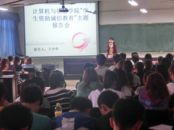 2013年5月28日下午,计算机与信息学院举办了“学生资助,诚信教育”主题教育报告会。会上,我院党总支副书记于少华结合自己的亲身经历,风趣幽默、深入浅出地阐释了诚信的内涵和价值。并进一步指导学生在享受国家资助的基础上,学会感恩社会、回报社会及父母。报告会持续了一个多小时,在2012-2013学年度中享受国家资助的180多位学生参加了本次报告会。会后,学生们纷纷表示受益匪浅,并承诺将在今后的学习生活中诚实守信、感恩社会。