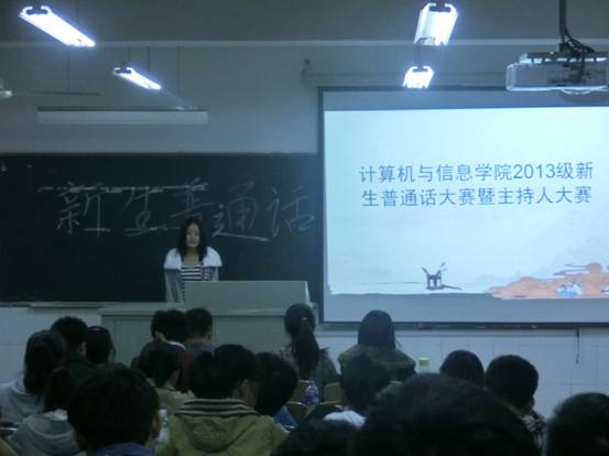 为了在我院新生中宣传普及和推广普通话,提高13级新生学生的综合素质。计算机与信息学院于2013年10月19日晚7点在实验A楼306举办了计算机与信息学院2013级新生普通话大赛暨主持人大赛。