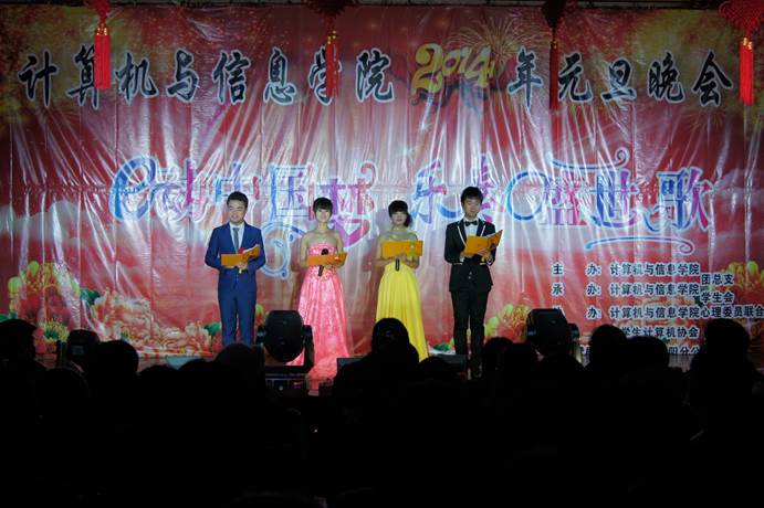 2013年12月29日晚6点30分,计算机与信息学院西湖校区小礼堂隆重举办了2014年“e动中国梦,乐奏盛世歌”主题元旦晚会。计算机与信息学院院长王戴木、优秀青年教师谭拂晓博士、兼职辅导员刘争艳老师、团总支书记徐悦老师应邀出席本场晚会,并和在场的600多位观众一同欣赏了这场视觉盛宴。