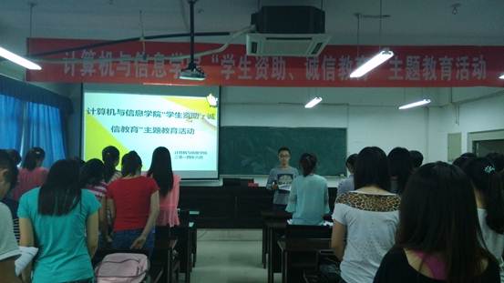 为宣传、倡导诚实守信的契约精神,促使我院学生树立诚信观念、增强大家的法律意识,同时落实相关文件精神。计算机与信息学院于5月下旬在全院范围内集中开展“学生资助,诚信教育”主题教育活动,本次活动得到我院党政领导的高度重视和积极支持。