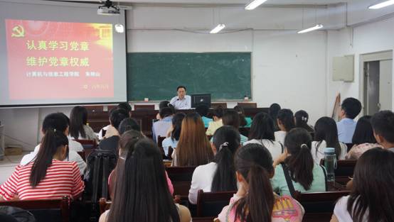 6月7日下午,计算机与信息工程学院举行党章知识测试,之后党总支书记朱明山在实验B楼306室讲“两学一做”专题党课。报告会有学院党总支副书记王永刚主持。学院教工党员和学生党员聆听了党课。