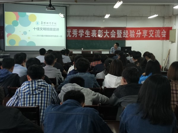 在经验交流分享环节,荣获校十佳文明班级、十佳文明寝室、优秀团支部和优秀学生代表孙金水、刘亚男、邹林雅、丁哲四人依次上台发言,分享他们的学习经验与心得。