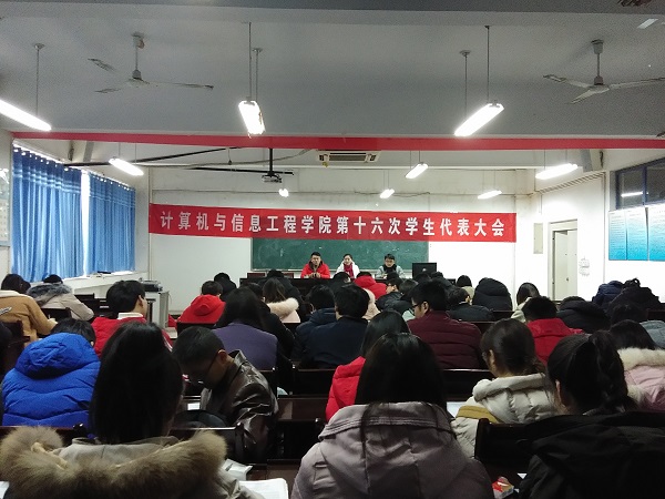 为更好的筹备我校第十六次学生会代表大会,2018年12月7日中午,计算机与信息工程学院于躬行楼B楼306召开第十六次学生会代表大会。该院团总支书记徐悦,学生会主席以及各班级67名学生代表出席了本次会议。
