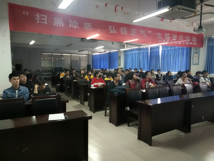 为深入学习习近平总书记对“扫黑除恶”专项斗争工作的重要指示精神和学校深入开展扫黑除恶专项行动推进会的有关行动要求,努力营造安全、文明、和谐、健康的校园生活环境,2019年4月25日中午,计算机与信息工程学院在学院团总支书记徐悦的安排布置下,举办“扫黑除恶,弘扬正气”特别主题团日活动,2016、2017、2018级各班级团干部参与了本次会议。