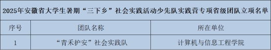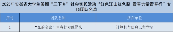 近日,共青团安徽省委、安徽省学生联合会公布了2025年安徽省大学生暑期“三下乡”社会实践活动相关专项团队名单,计算机与信息工程学院“红韵金寨”青春行实践团队入选“红色江山红色路 青春力量青春行”专项,“青禾护安”社会实践队入选少先队实践营专项。