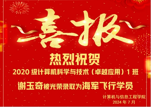 2023年10月,2020级计算机科学与技术(卓越应用)1班谢玉奇同学,报名了面向地方大学生的2024年海军招飞,经历了四轮选拔,凭借优异的综合素质,脱颖而出,被光荣地录取为海军工程大学海军飞行学员,成为我校首位直招海军飞行员。