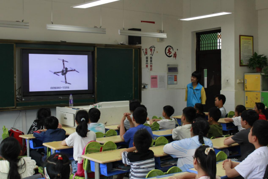 “什么是无人机?”、“无人机有那些类型?”、“中国的无人机”等问题引发了小学生们的思考、讨论和参与,志愿者们用视频、展板逐一为孩子们介绍无人机的类型、飞行原理,对比了军用无人机和民用无人机的特点。志愿服务团队特别介绍了国产无人机自主品牌——“大疆”旗下的各款产品,到危险区域参与应急救援的无人机,专用于古建筑和文化遗址测绘建档的无人机等,激发了少年儿童的科技报国热忱。