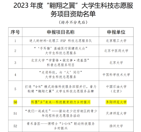 近日,中国科学技术协会发布了《关于2023年度“翱翔之翼”大学生科技志愿服务评审结果的公告》,最终确定清华大学、北京大学等全国100家单位作为2023年度“翱翔之翼”大学生科技志愿服务项目资助对象。我院团委负责人王毅恒申报的“科墨‘乡’未来--科技教育助力乡村振兴”项目入选《2023年度“翱翔之翼”大学生科技志愿服务项目资助名单》,也是我院连续两年获得中国科协“翱翔之翼”大学生科技志愿服务项目资助。