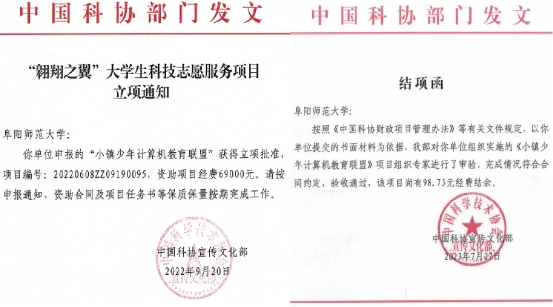 为深入学习贯彻习近平新时代中国特色社会主义思想,引领大学生积极投身科技志愿服务事业,2023年中国科协、教育部、共青团中央联合发文,在全国范围内广泛开展宣传动员,面向全国高校、科研院所和科技场馆(包括科技馆、科普教育基地、科学家精神教育基地等)组织项目申报,拟遴选100家单位。2022年我院小镇少年计算机教育联盟项目首次获得中国科协“翱翔之翼”大学生科技志愿服务项目资助并顺利结项。