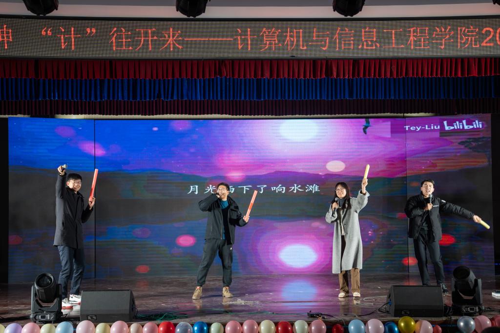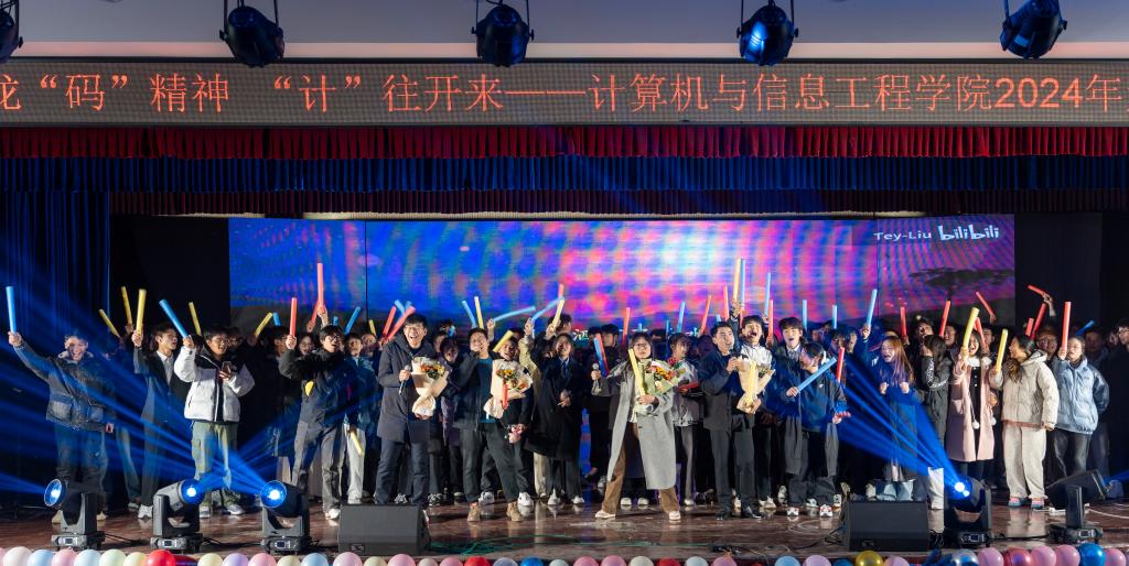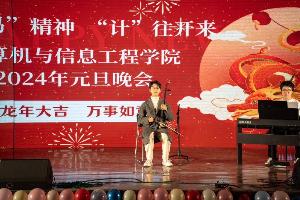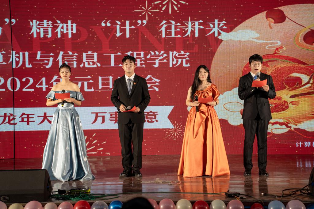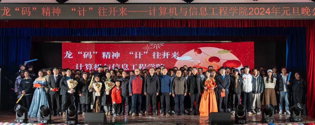 2024年1月2日晚,计算机与信息工程学院在西湖校区景行楼小礼堂举行了2024年元旦晚会。此次晚会以“龙‘码’精神,‘计’往开来”为主题,现场气氛热烈,师生们欢聚一堂,共同庆祝新年的到来。校团委副书记杨劲、计算机与信息工程学院党政领导和近300名师生代表参加晚会。