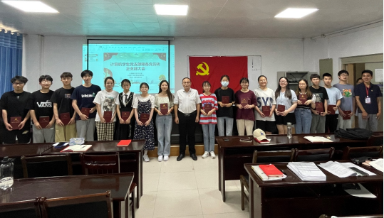 王毅恒代表党支部感谢学院党委对计算机学生党支部党建工作的重视和支持,并邀请朱明山为新发展的党员颁发党员学习笔记本,同时合影留念。
