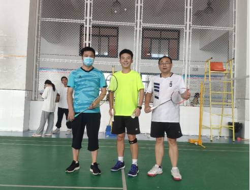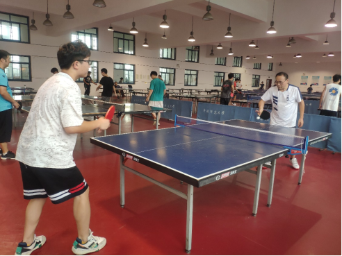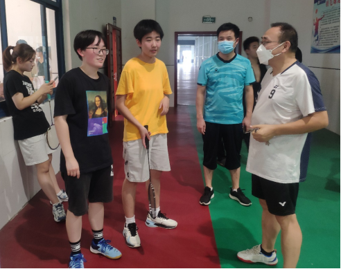 朱明山和王诗兵为同学们发放运动器材与同学切磋羽毛球和乒乓球运动,并与同学合影留念。