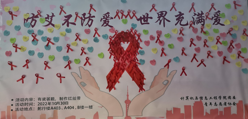 10月30日,计算机与信息工程学院青年志愿者协会在躬行楼A和躬行楼B举办了以“防艾不防爱,世界充满爱”为主题的预防艾滋病宣传活动。