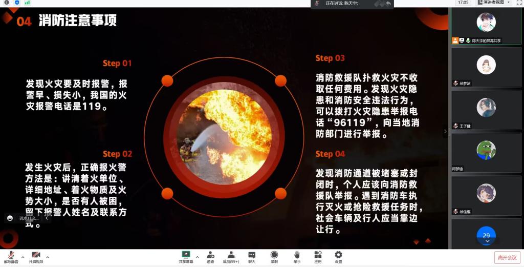 消防观影在线上进行,活动负责人首先讲解消防宣传PPT,向大家讲解了基本的消防知识,包括火灾发生的原因、怎样预防火灾、灭火器的正确使用以及如何正确报警等内容。随后开始观看消防影片《烈火英雄》, 电影源于“大连7·16大火”真实事件改编,电影中消防员们应招而战,誓死如归,以生命维护国家及人民财产安全,英雄事迹让同学们对消防安全有了更深刻的认识。