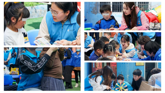 在颍上县星缘康复托养中心,志愿者向孤独症小朋友展示了电动摩天轮、单杠旋转机器人、电动积木小车的工作原理,讲述中国科学家的故事,讲解并演示无人机操作,并使用轻质粘土和小朋友们共同制作花鸟模型等。小朋友也通过表演简单的舞蹈和非洲鼓节目向大学生志愿者表达感谢。