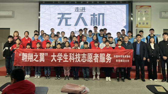 2023年4月23日,阜阳师范大学“翱翔之翼”大学生科技志愿服务项目团队前往安徽省金寨县白塔畈镇实验学校开展科普小课堂活动,宣传中国古代科技和现代无人机技术。