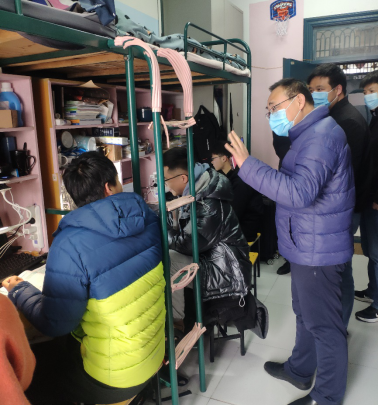 在学生宿舍调研时,朱明山、王诗兵等与同学们亲切交谈,了解他们返校及学习、生活情况,认真询问了同学们对校园网络建设、宿舍管理等方面的看法,实地查看了宿舍卫生、安全用电等情况,叮嘱大家一定要严格遵守学校疫情防控制度,抓紧时间复习备考,并提醒同学们要注重身体健康,预防感冒发烧。