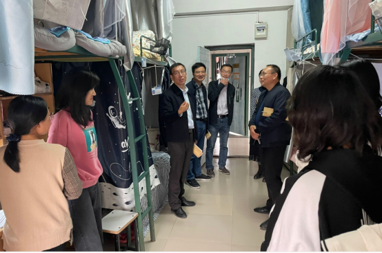 在学生宿舍,季爱新一行认真查看了宿舍公共设施、宿舍内务、宿舍基础设施情况。与同学们亲切交谈,了解他们学习生活情况,听取了他们对学校工作的意见建议,鼓励他们抓住信息技术飞速发展的机遇,努力提升专业技能,相互帮助,共同营造一个良好的学习生活环境。