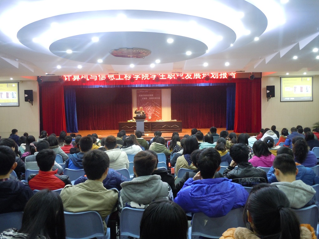 为搭建学生与行业先锋对话的平台,为校园中的花朵打开一扇通往社会的窗口,计算机与信息工程学院于11月30日上午在西区小礼堂成功举办学生职业规划报告会。本次报告会特邀上海尚观信息技术有限公司执行董事、资深IT职业规划师张见蓬先生担任主讲人。计算机与信息工程学院党总支书记朱明山主持了本次报告会,学院部分老师和2014级新生参加了此次报告会。