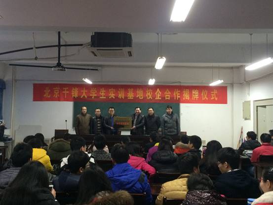 2016年1月12日下午,计算机与信息工程学院和北京千锋互联科技有限公司“大学生实训基地”校企合作揭牌仪式在学院306会议室隆重举行。仪式由计算机与信息工程学院院长王戴木主持,阜阳师范学院校党委委员、副院长汪芳启、北京千锋互联科技有限公司院校合作大区总监吕震、计算机与信息工程学院党总支书记朱明山、副院长王峰、北京千锋互联科技有限公司安徽区院校合作经理杨元祥等出席揭牌仪式。