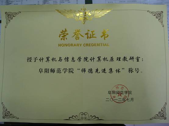 计算机与信息学院全体师生热烈祝贺:原理教研室荣获阜阳师范学院2012年度“师德先进集体”称号、杨颖老师荣获校“师德标兵”称号、王慧玲老师荣获校“师德先进个人”称号。
