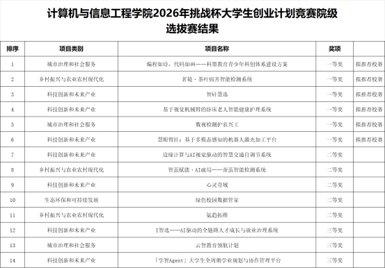 根据《关于举办2026年“挑战杯”大学生创业计划竞赛校内选拔赛的预通知》校青[2025]12号等文件精神,经2026年3月20日专家组评审,拟推荐《编程如诗,代码如画——科墨教育青少年科创体系建设方案》等6组作品参加阜阳师范大学2026年“挑战杯”大学生创业计划竞赛。
