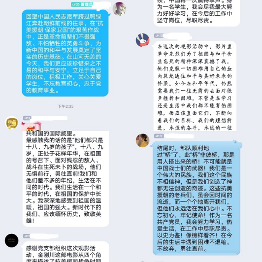 观影结束后,师生党员们在支部群内进行了交流分享,大家纷纷表示和平来之不易,要珍惜现在的生活,时刻以革命先烈不畏困苦、英勇顽强、无私奉献的战斗精神激励自己,立足于工作岗位和专业知识学习,强化担当和进取精神,为党的事业发展献出自己的一份力量。
