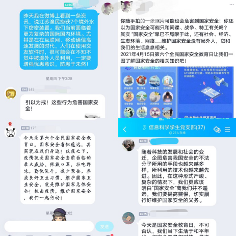 为深入学习贯彻习近平新时代中国特色社会主义思想,着力防范化解重大风险,在第6个全民国家安全教育日之际,2021年4月15日,计算机与信息工程学院信息科学学生党支部就“维护国家安全,增强防范意识”组织师生党员在线上展开热烈讨论,讨论由支部书记杨莉莉主持。