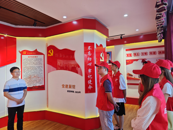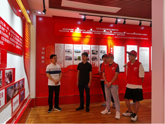 师生党员在讲解员的引导下参观了白行社区党建展览馆。2003年白行社区遭遇到了洪涝灾害,农田被淹,房屋被水浸泡,那时的村里交通不便和基础设施不健全。在第一书记闫永志的带领下,2006年开始白行社区围绕新农村建设和美好乡村建设的要求,制定了“三年打基础,五年见成效,八年上规模”的目标,后来在脱贫攻坚、乡村振兴方面也取得了很大的成绩。