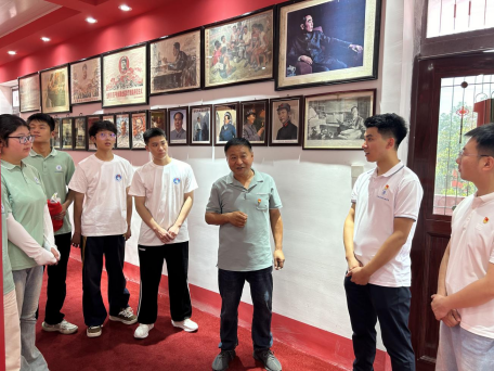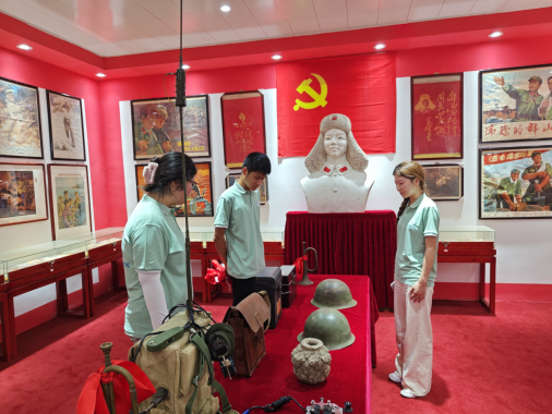 触摸百年红色脉搏。在陈列着新民主主义革命至社会主义建设时期数百件文物的三层展馆中,形态各异的毛主席像章,制作精良,每一枚都铭刻着特定历史时期的印记,见证了党领导下的伟大征程;泛黄的画报和地图,以直观的形式展现了不同时期的战略布局与发展脉络;栩栩如生的人物雕塑,生动再现了革命先辈们坚定的神情与无畏的姿态;还有老式时钟、瓷器茶壶等实物,从生活的细微之处折射出时代的变迁,让同学们深切感受到革命先辈们在艰苦环境中仍保持的乐观与坚韧。