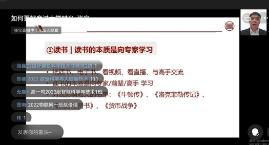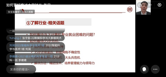 为引导学生加强专业知识学习,深入了解IT技术的发展,帮助同学们树立明确的职业发展目标与职业理想,计算机与信息工程学院于2022年11月16日下午邀请行业专家、IT 职业教育新锐品牌“良师良职”创始人张宝开展主题为“如何更好度过大学时光”的线上讲座。讲座由计算机与信息工程学院副院长王先超主持,我院400余名学生参加此次讲座并进行线上交流研讨。