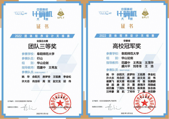 近日,2022年“中国高校计算机大赛——团体程序设计天梯赛”成绩揭晓,我校组建的4支参赛队全部获奖。其中范建中、王秀友指导的“行山”代表队在“华山论剑”组荣获全国总决赛团队三等奖及安徽省团队一等奖,谢天意、赵文龙两位同学获得全国个人三等奖,同时学校获得“华山论剑”组安徽省高校冠军奖。