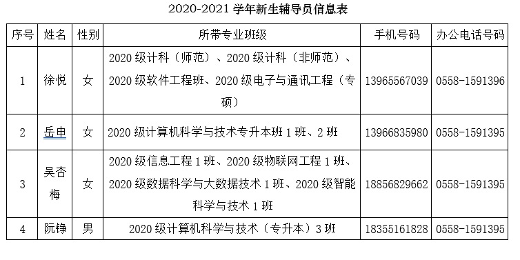 2020-2021学年新生辅导员信息表