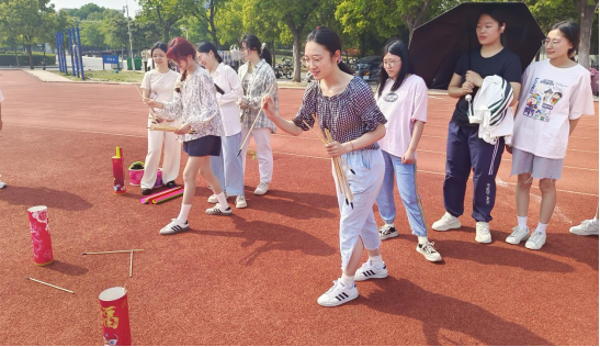 不倒森林活动。随着一声声的号令,同学们人手一杆,围成圆圈,团队成员们将速度与节奏保持一致,快速地移动着步伐进行交接。通过口号传递的精神力量,同学们对于合作精神有了具象化的感悟。