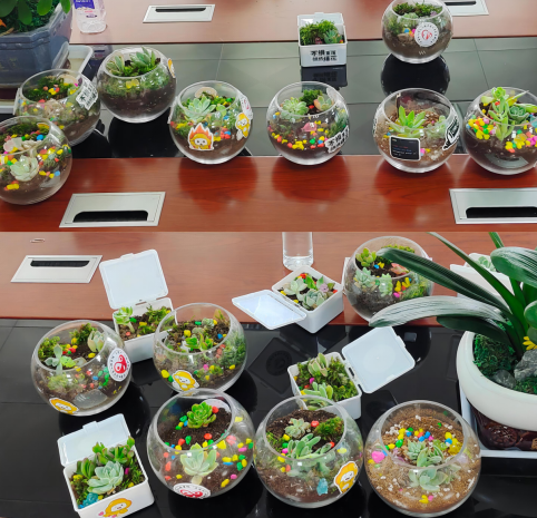 在微景观DIY创作环节中,同学们充分发挥想象力,将童年的美好记忆、对未来的憧憬等情感融入作品中。大家全神贯注地完成砂石铺设、绿植安置和摆件摆放等步骤,在动手实践中逐渐放松心情,享受着创作带来的成就感与喜悦。