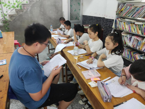 志愿者给留守儿童进行学业帮