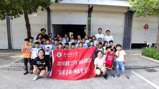 “颍淮善郡·科教留守”暑期社会实践团队成员与留守儿童合影
