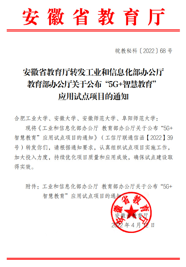 近日,工业和信息化部办公厅、教育部办公厅联合发布了《关于公布“5G+智慧教育”应用试点项目的通知》(工信厅联通信函〔2022〕39号),我校牵头申报的《基于5G+AI的智慧教育新生态建设与应用》项目成功入选。