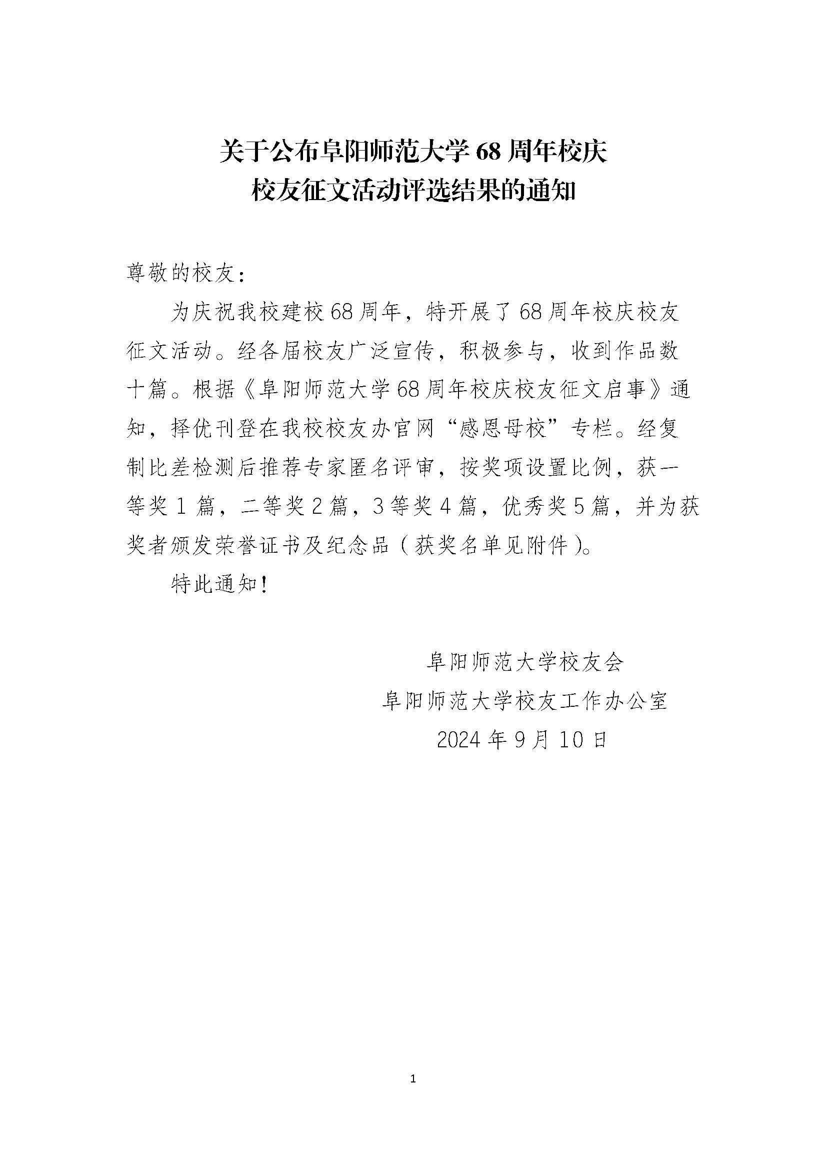 关于公布阜阳师范大学68周年校庆 校友征文活动评选结果的通知
